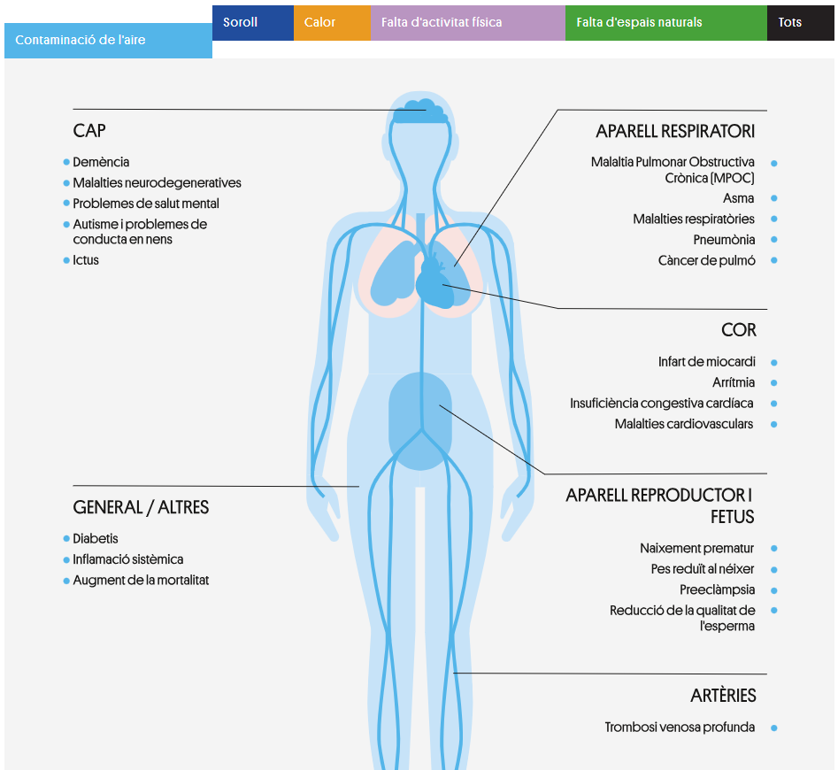 La contaminació, tant a l’aire exterior com interior, pot provocar mortalitat prematura i nombroses malalties. Hi ha una gran quantitat d’evidència científica que relaciona la contaminació de l’aire amb l’asma, la MPOC, el càncer de pulmó i altres malalties respiratòries, així com amb un major risc d’ictus, malalties neurodegeneratives, problemes de salut mental, malalties cardiovasculars, problemes en l’aparell reproductor i en el desenvolupament fetal, entre d’altres.
