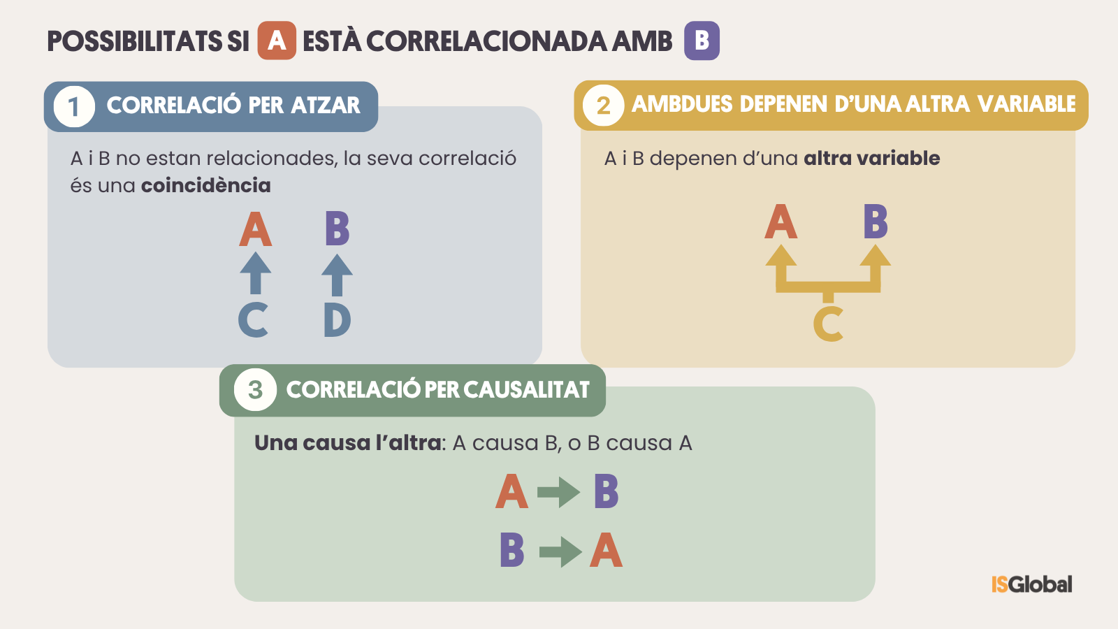 Podem parlar de causalitat entre dues variables només quan podem demostrar que una provoca un canvi en l’altra. Establir una causalitat en biologia no és fàcil, ja que hi intervenen moltes variables. Calen experiments controlats o bé analitzar moltes dades de moltes persones al llarg del temps.
