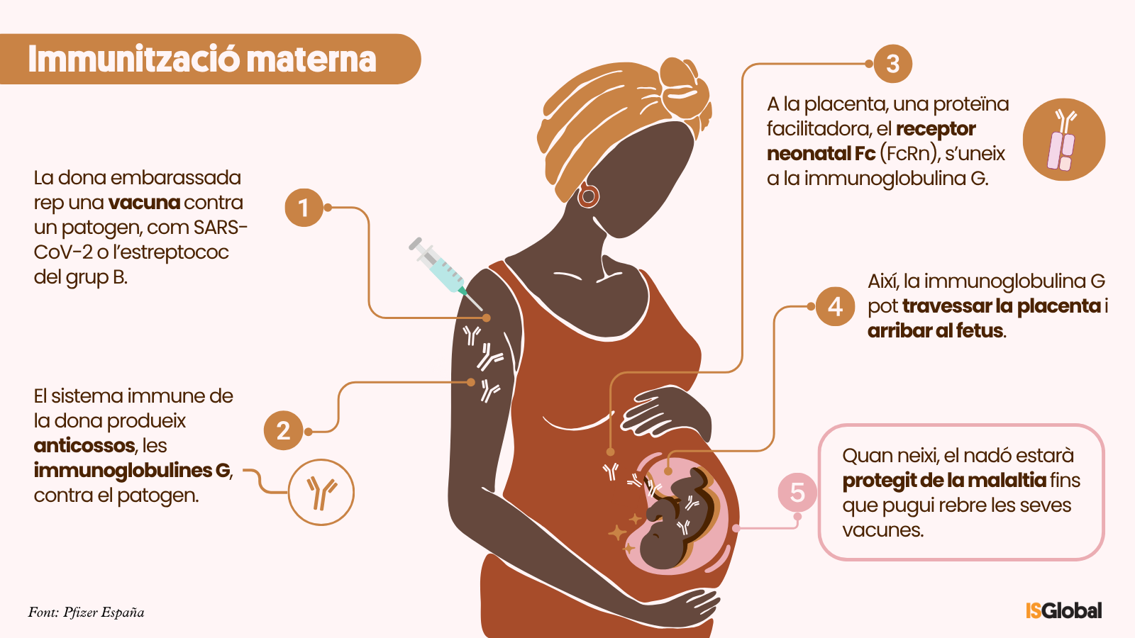 Per tal de transferir immunitat protectora al seu nadó, una dona embarassada ha d’haver adquirit anticossos específics contra la malaltia mitjançant una exposició prèvia al patogen. Tot i així, en alguns casos, els nivells d’anticossos transferits no són suficients per oferir una protecció adequada. Per això, la vacunació durant l’embaràs permet reforçar aquesta resposta immunitària, assegurant nivells òptims d’anticossos materns i, per tant, una millor protecció del nadó davant malalties prevenibles durant els primers mesos de vida.
