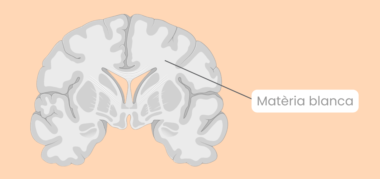 Al cervell, la matèria blanca es troba a les zones més profundes i connecta diferents àrees de l’escorça cerebral amb altres estructures internes, com els ganglis basals i el tàlem, que ajuden a controlar el moviment, la coordinació, el son o la recepció d’informació sensorial. Així, la matèria blanca és essencial per transmetre informació entre múltiples àrees del cervell, cosa que permet funcions crucials com caminar, aprendre i prendre decisions.