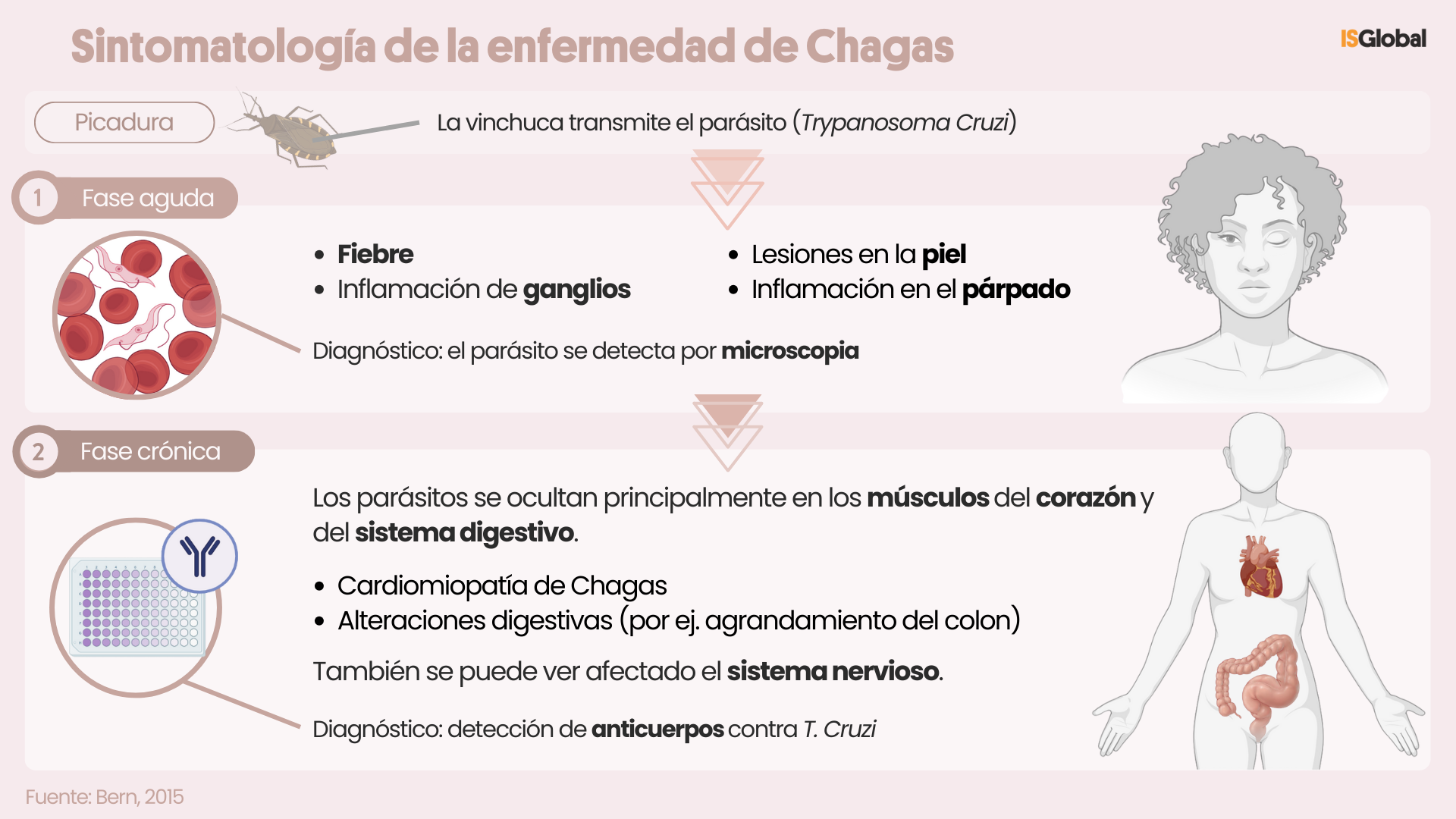 En la fase crónica, los parásitos se ocultan principalmente en los músculos del corazón y el sistema digestivo. Décadas después de la infección, hasta un tercio de los pacientes puede desarrollar problemas cardíacos, como arritmias o insuficiencia cardíaca, y aproximadamente un 10 % presenta alteraciones digestivas, como el agrandamiento del esófago o el colon. En los casos más graves, la enfermedad puede provocar la muerte súbita por problemas cardíacos o insuficiencia progresiva debido al daño en el corazón. Además, puede haber afectación digestiva con gran impacto en la calidad de vida y afectación del sistema nervioso, más frecuente en personas con inmunosupresión.