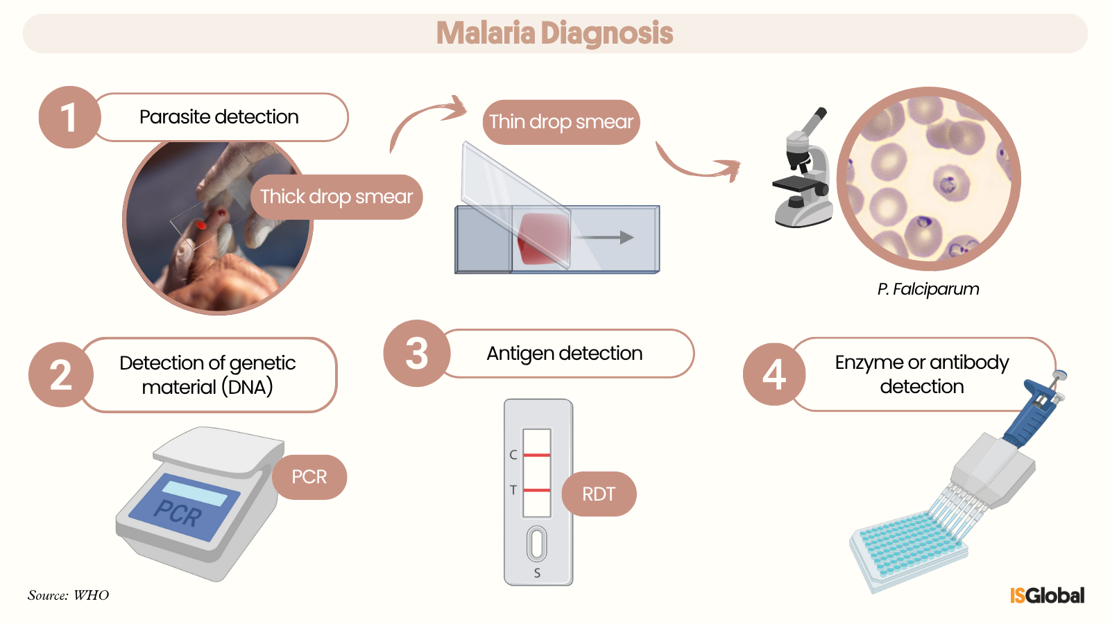 Rapid diagnostic tests (RDTs) detect parasite antigens in the patient’s blood.