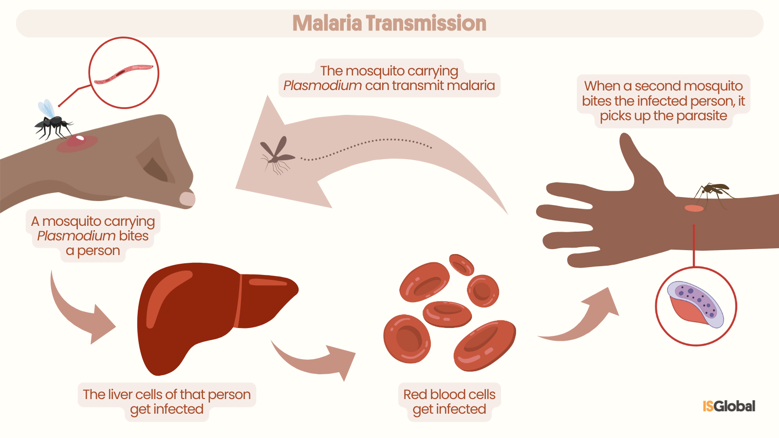 In most cases, malaria is transmitted by the bite of a female Anopheles mosquito, which acts as a vector by transmitting the Plasmodium parasite to humans. These mosquitoes acquire the parasite when they bite an infected person. When they then bite a healthy person, the parasites are transmitted into the bloodstream, infecting liver cells and later red blood cells.