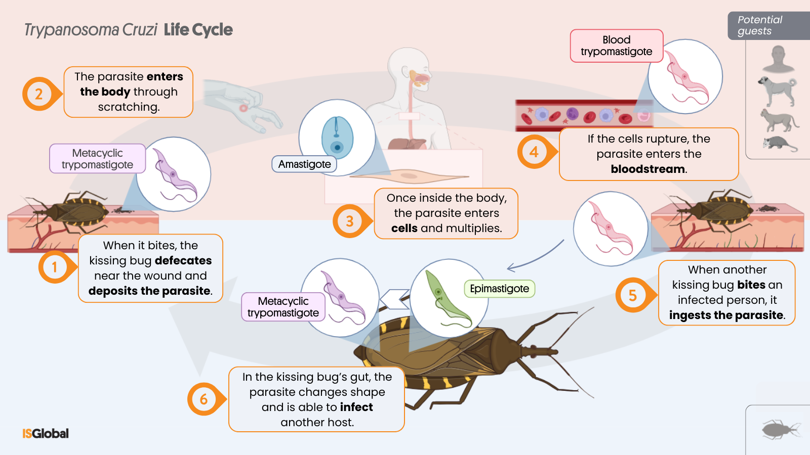 - The kissing bug feeds on the blood of humans or animals (such as dogs, cats, marsupials, or rodents) and defecates near the bite site. Its faeces contain the parasite in a form called the metacyclic trypomastigote.