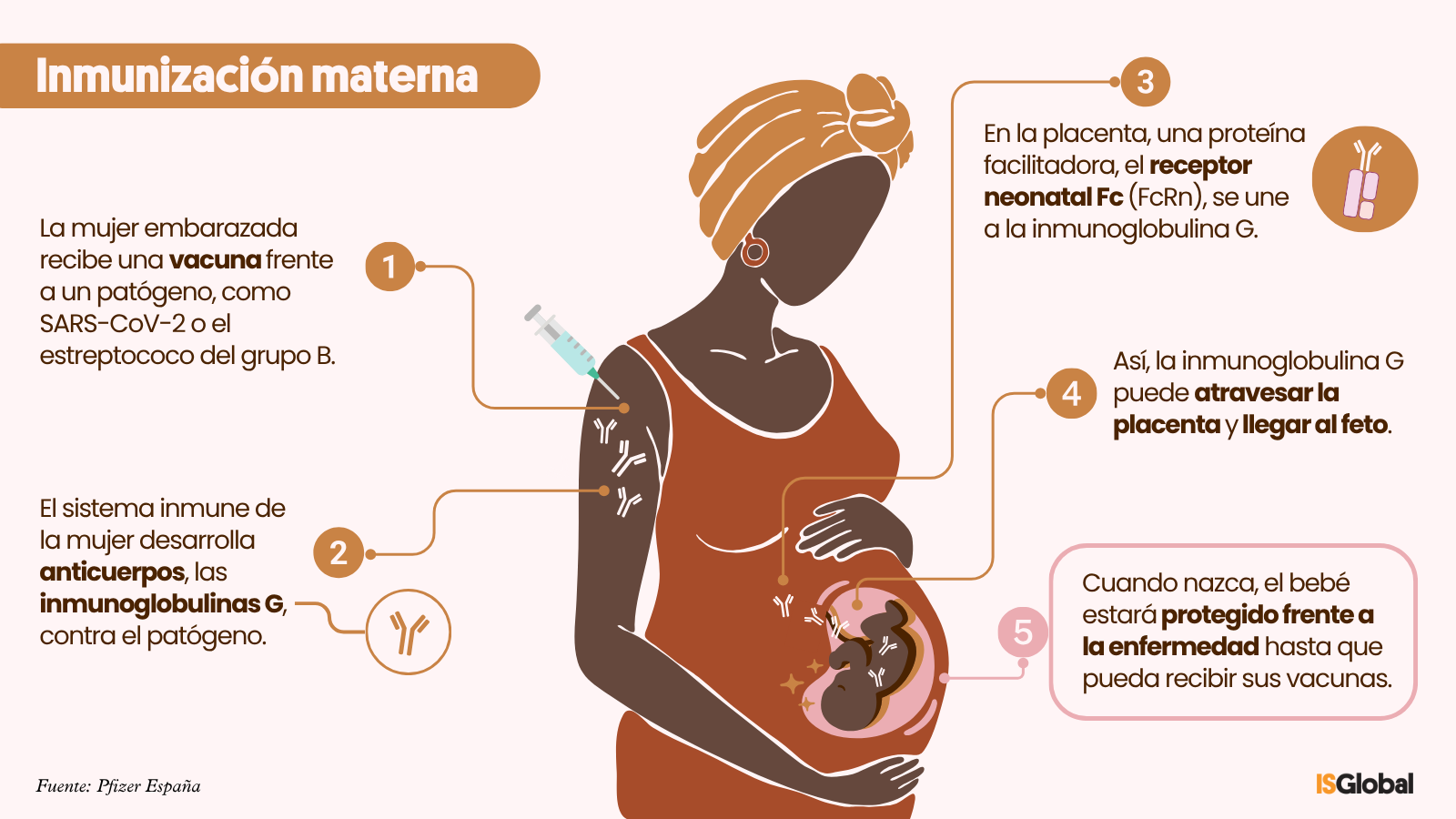 Para transferir la inmunidad protectora a su bebé, una mujer embarazada necesita haber adquirido anticuerpos específicos contra la enfermedad por una exposición previa a un patógeno, como un virus o una bacteria. Sin embargo, en algunos casos, los niveles de anticuerpos transferidos no son suficientes para brindar una protección adecuada. Por ello, la vacunación durante el embarazo permite reforzar esta respuesta inmunitaria, asegurando niveles óptimos de anticuerpos maternos y, en consecuencia, una mayor protección para el bebé en los primeros meses de vida frente a enfermedades prevenibles.