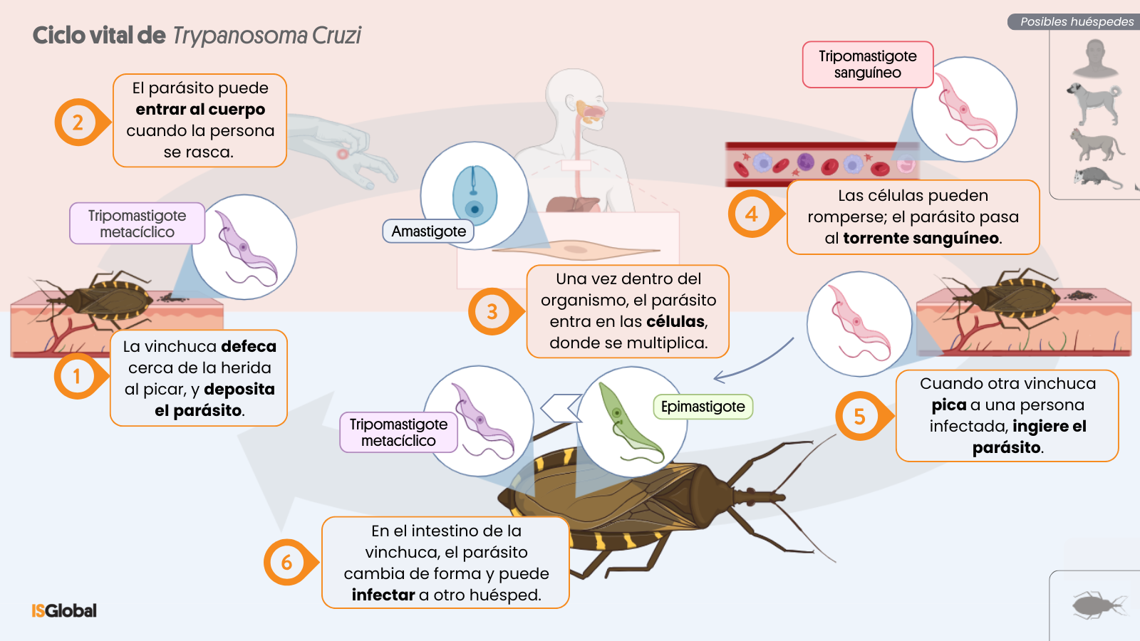 El Trypanosoma cruzi tiene un ciclo de vida complejo que involucra a dos tipos de huéspedes: el insecto triatomino (vinchuca) y el ser humano u otros mamíferos. Se desarrolla en varias etapas: